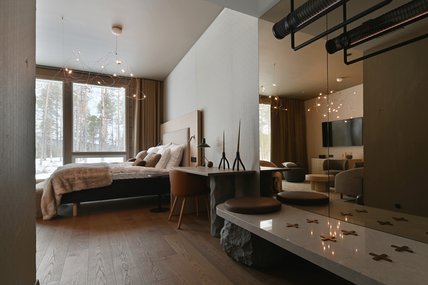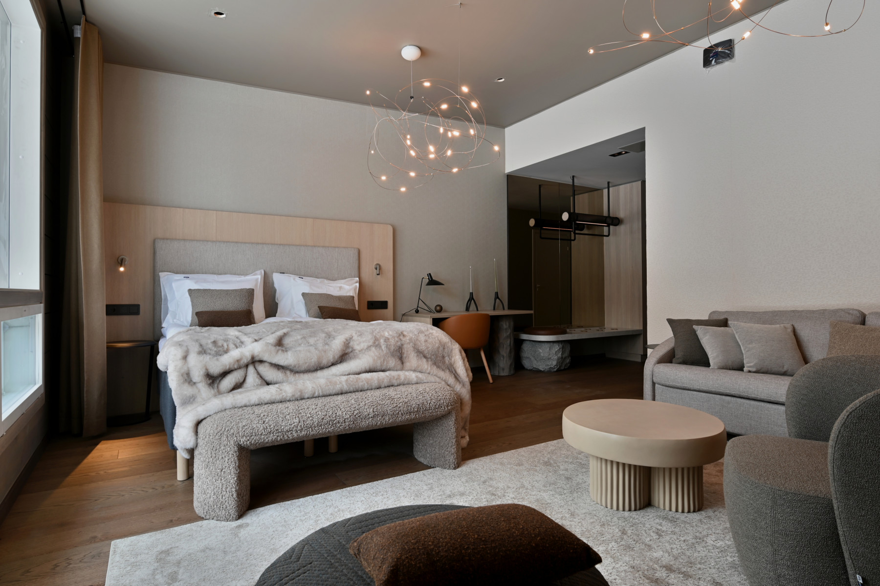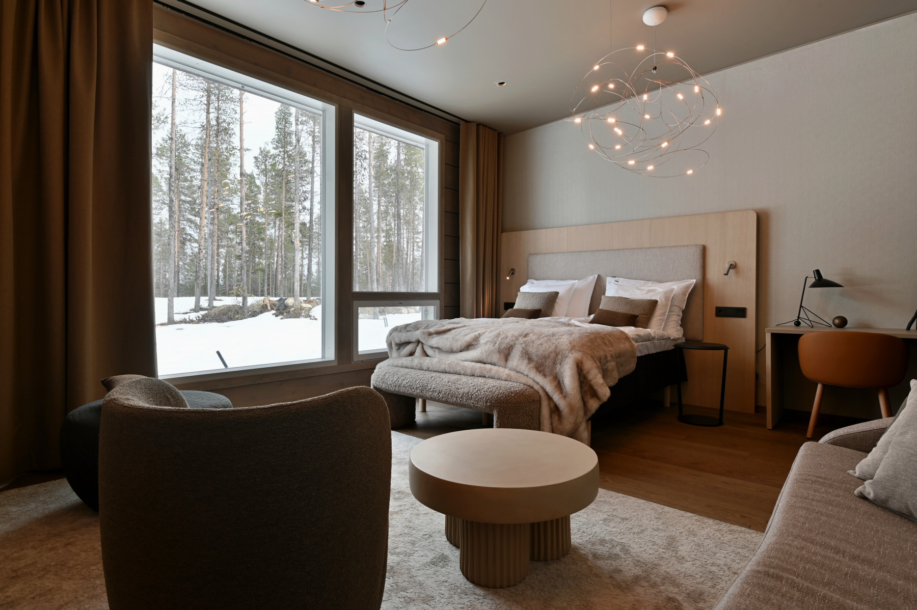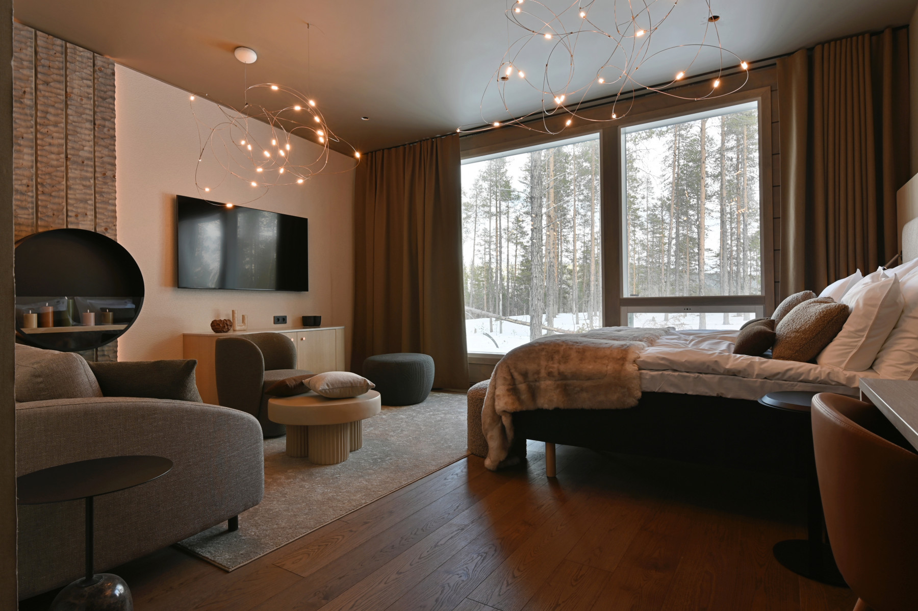 Die Lodge bietet verschiedene luxuriöse Suiten und gemütliche Glasiglus mit direktem Blick in die weiße Winterlandschaft. Hochwertige Annehmlichkeiten wie Kingsize-Betten, großzügige Panoramafenster, eigene Saunen und stimmungsvolle Beleuchtung sorgen für höchsten Wohnkomfort. Für Familien oder Paare stehen unterschiedliche Suite-Kategorien sowie miteinander verbundene Zimmer zur Verfügung.